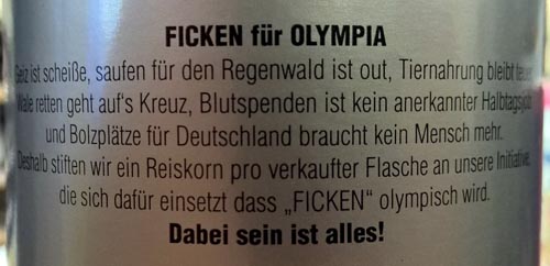 Anmerkung von Gregor zum "Ficken"-Likör: "Wirf mal einen Blick auf die Rückseiten der Faschen. Für Leute mit mehr Humor als Niveau."