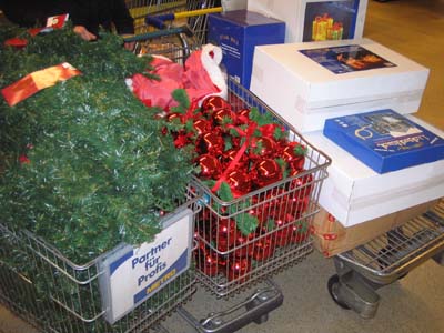Wie gestern Vormittag schon angekündigt, war abends noch ein umfangreicher Metro-Besuch fällig. Für beide Läden zusammen haben wir massenhaft Dekokugeln, große Lichterketten, künstliche Weihnachtsbäume, Tannengirlanden und einige dieser von Lichtschläuchen umrandeten 3D-Figuren besorgt. Wer bei letzteren jetzt an gnadenlosen Kitsch denkt - wartet's ab, das wird schon nett.
