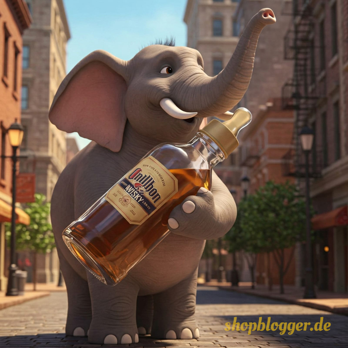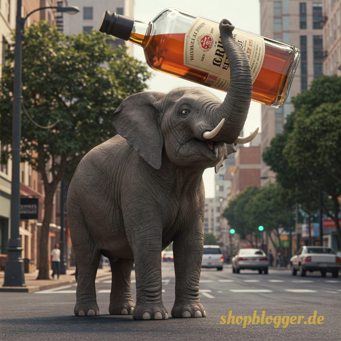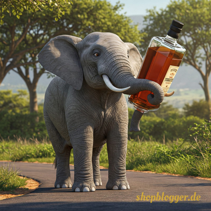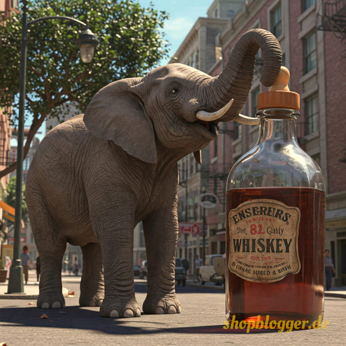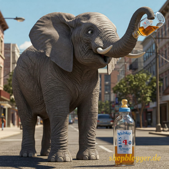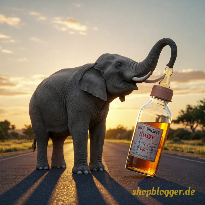 Es gibt Aufgaben, die per KI nur mühsam bis gar nicht umzusetzen sind und diese Idee, eine Whiskyflasche so zu halten wie im oben verlinkten Bild, wollten sowohl ChatGPT als auch Gemini partout nicht umgesetzt bekommen. Auch nicht, als wir Bilder von milchflaschenhaltenden Elefanten als Vorlage hochluden, es half alles nichts.