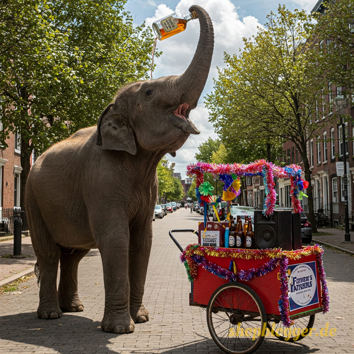 Ich hatte den Gedanken, dass ich zum letzten Vatertag einen Elefanten rendern lassen könnte, der im Stil der Waisen mit ihren Milchflaschen eine Whiskyflasche hält und daraus trinkt.