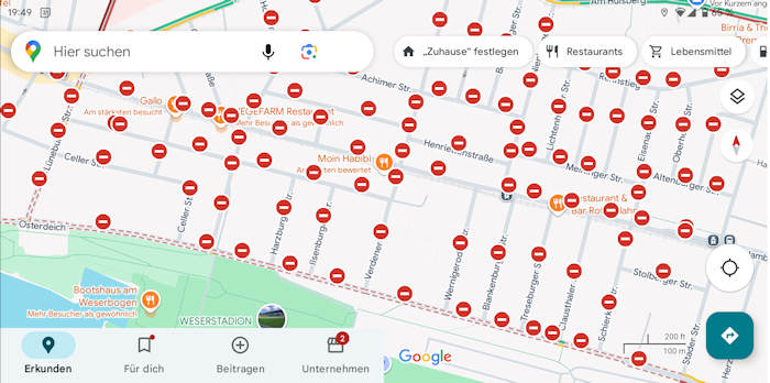 Als ich später zu Hause Ines die Strecke zeigen wollte, präsentierte sich in Google Maps ein etwas kurioser Anblick. So viele gesperrte Straßen auf einem Haufen sieht man da wohl auch selten:
