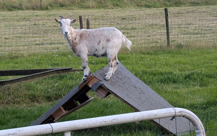 Auf einem Bauernhof hier hinter Bremen hatte ich im Vorbeifahren einen eingezäunten Bereich mit ein paar Ziegen entdeckt. Dass Ziegen gerne klettern, wusste ich wohl. Aber denkt man ja, wenn man keinen unmittelbaren Kontakt zu Ziegen hat, auch nie drüber nach. Umso erstaunter war ich in dem Moment, als mich eine Ziege neugierig auf einem kleinen, aus Paletten gebauten, Dach stehend ansah.