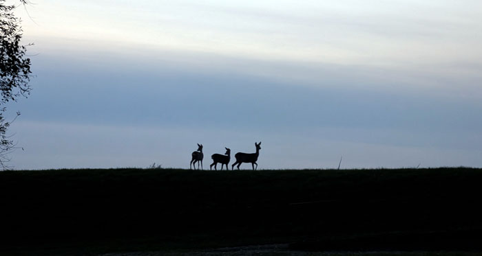 Auf dem Weg nach Hause entdeckte ich ein paar Rehe, die auf einem Deich standen. Hatte die Szene im Vorbeifahren zunächst gar nicht als das erkannt, was es war. Nach ein paar Sekunden realisierte ich es, hielt an und fuhr zurück und zum Glück standen die drei Rehe noch so dort oben, das man ihre Silhouetten gegen den Abendhimmel sehen konnte.