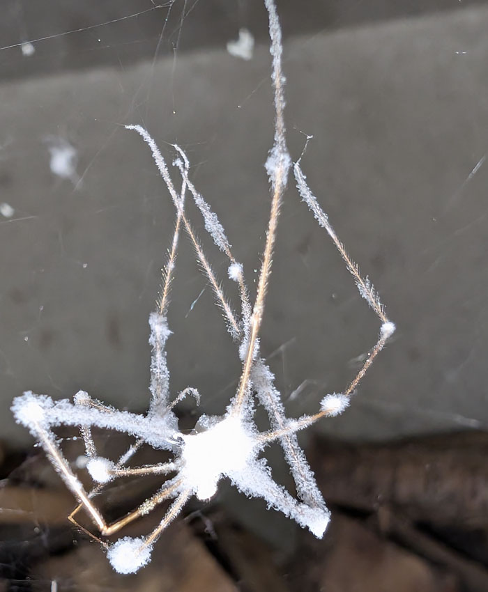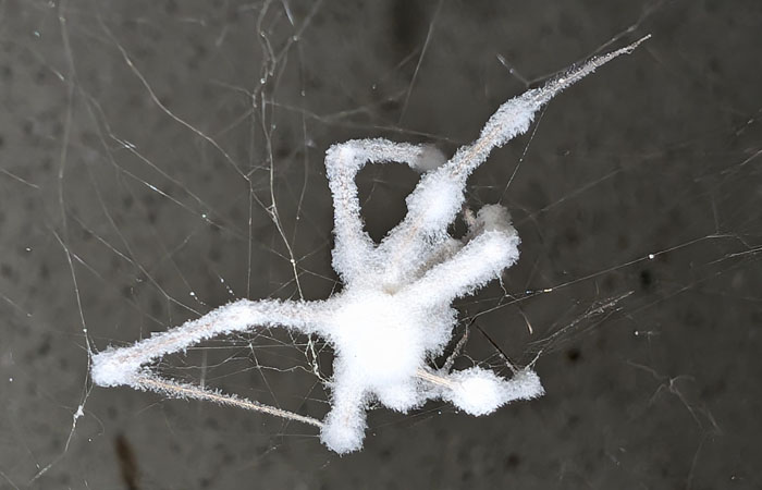 Kurz: Durch Feuchtigkeit vermehren sich Schimmelpilze besonders gut und diese Spinnen sind für bestimmte Pilze besonders anfällig. Solange sie sich häuten können, fällt der Pilz mit ab, aber sobald die Spinnen ausgewachsen sind, ist ihr Schicksal besiegelt – bis sie wie eine eingewickelte Mumie in ihren Netzen baumeln. Bei allen Spinnenphobikern könnte so eine Begegnung noch einmal richtig kicken.
