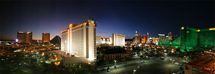 vier drei Hotels/Casinos Excalibur, New York New York und MGM Grant. Das Tropicana, die beiden großen hellen Gebäude in der Bildmitte, gehört seit Anfang dieses Jahres nicht mehr dazu, denn es wurde inzwischen
