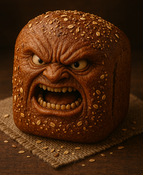 Die Idee zum "Vollzornbrot" hatte ich aus dem Film Hotel Transsilvanien, aber die grafische Umsetzung dazu durfte ChatGPT abliefern. Ich find's gut geworden. Sehr viel zorniger kann ein Brot wohl nicht gucken.