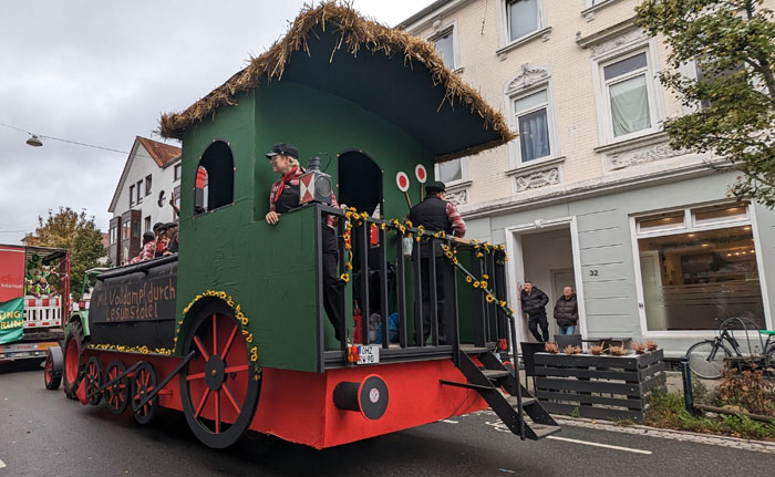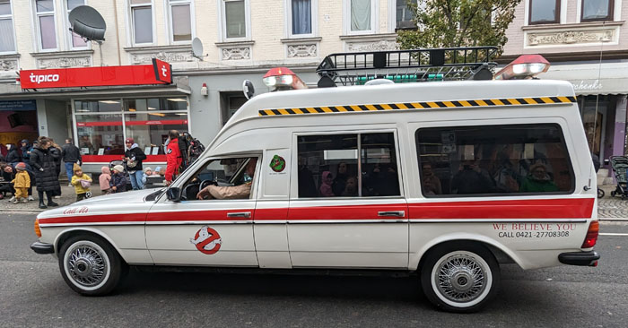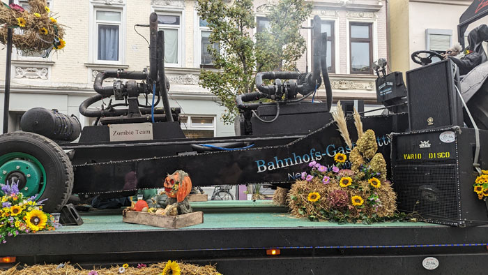Dieser sehr aufwändig dekorierte Halloween-Wagen, über dessen Urheber gar nichts zu finden war, stand fast den ganzen Vormittag hier vorm Laden, hat erfreulich wenig Lärm gemacht und hat sich als eines der letzten Fahrzeuge in den Treck eingereiht.