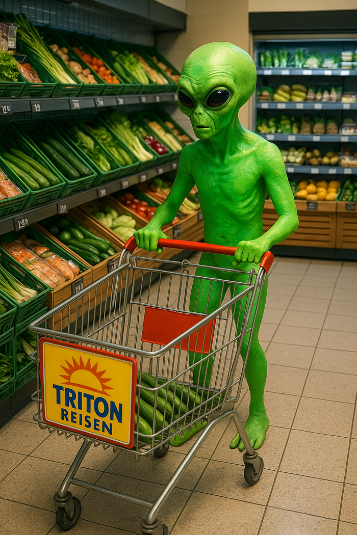 Ich wollte auf nichts Spezielles hinaus, als ich ChatGPT den Job gegeben hatte, ein einkaufendes Alien in einem Supermarkt zu generieren. Das Bild ist eigentlich to