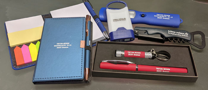 Neben dieser Taschenlampe habe ich von der Firma, bei der ich meine Triton-Werbekugelschreiber bestellt hatte, im Laufe der Zeit auch schon einige andere Muster für mögliche Werbeartikel/Giveaways bekommen. Besagte Taschenlampe und auch andere, Flaschenöffner, Notizbüchlein und natürlich die unterschiedlichsten Kugelschreiber. Ich bin noch nicht so ganz sicher, was ich damit machen soll. An Interessierte verschenken? Da das ja (für mich) nicht die Massenware ist, finde ich es fast zu schade, die Sachen abzugeben. Aber meine Kulis, die sind wirklich toll (und auch nicht ganz günstig, Werbekulis gibt es auch für deutlich weniger Geld), die verteile ich sehr gerne.