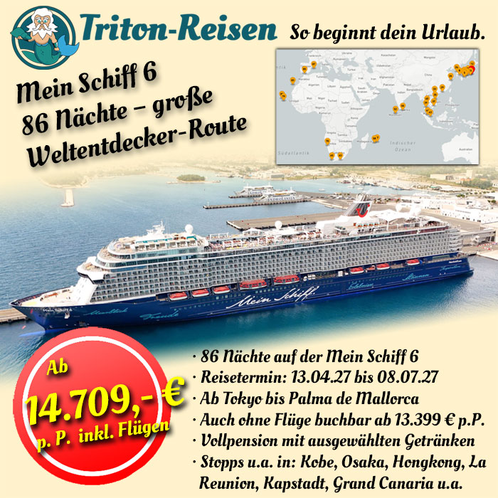 Die Route ist zwar keine Weltreise, aber nicht uninteressant: Tokyo - Kobe - Busan - Shimizu Ward - Osaka - Kochi - Shanghai - Hongkong - Ha Long - Chan May - Ko Samui - Bangkok - Singapur - Colombo/Sri Lanka - Male/Malediven - Port Louis/Mauritius - La Reunion - Kapstadt - Walfischbucht - Kapverden - Gran Canaria - Gibraltar - Palma de Mallorca. Das alles gibt es ab 13.399 Euro pro Person oder mit beiden Flügen (nach Tokyo und zurück von Mallorca) ab 14.709,- Euro p.P.