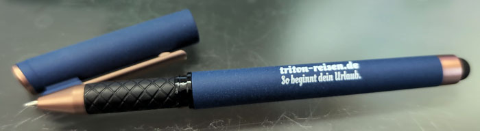 Von der Firma, bei der ich auch schon die erste Serie unserer Triton-Werbekugelschreiber bestellt hatte, habe ich ein Muster für einen sehr, sehr ähnlichen Typ Kugelschreiber bekommen. Quasi die gleiche Farbgestaltung, aber irgendwie noch eine Nummer cooler. Die Oberflächen sind matt gestaltet, wodurch der Stift auch besser in der Hand liegt. Das Design ist etwas kantiger, was ihn moderner wirken lässt und, ich mag es kaum zugeben, er schreibt sogar besser.