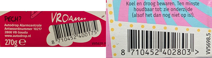 Fundstück von Susanne auf den holländischen Fruchtgummis der Marke "Autodrop". Vielen Dank für die Zusendung. Die schräg abgeschnittenen Strichcodes sind wenig spektakulär (noch weniger als sonst), aber das Drumherum ist durchaus erwähnenswert: