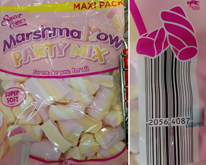 Der Strichcode dieser Packung Marshmallows von Lidl ist dekoriert mit … genau diesen Marshmallows, wer hätte es gedacht.