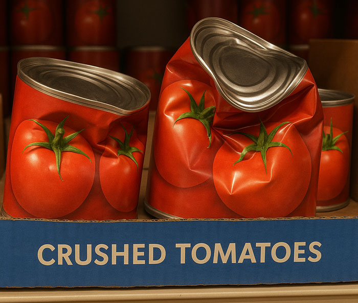 Funktioniert natürlich nur im englischsprachigen Raum. Dass die Dosen von passierten Tomaten zerdrückt werden, passiert auch mal, ihr erkennt schon den sich anbahnenden Wortwitz, aber so schön wie bei den "crushed Tomatoes" klappt es leider nicht.