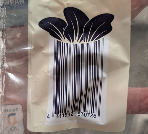 Fundstück von Ines in der heimischen Küche auf einer Packung "Mini Pak Choi" Kohl unserer Eigenmarke. Die markanten Blätter hätten zwar bei entsprechender Gestaltung schön aus dem Strichcode wuchern können, aber in diesem Fall soll der geschwungene obere Rand des Codes vermutlich eher eine Schüssel darstellen, in welcher die Blätter liegen …