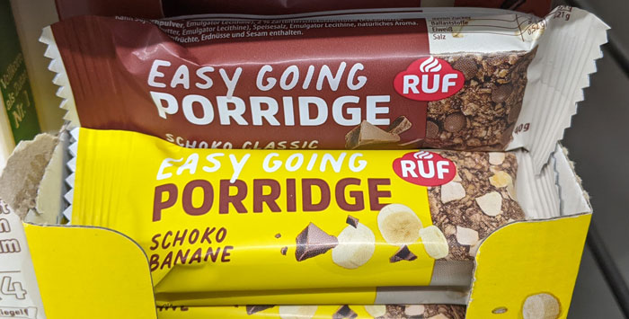 Die Artikel sind nicht weiter erwähnenswert (der von mir probierte "Pancake" mit Pistazien-Füllung hat mich leider auch nicht zu weiteren Tests motiviert), aber als eine Kollegin die Preisschilder an dem Aufsteller befestigt hat, musste ich schmunzeln. Mein erster Gedanke, den ich auch spontan laut aussprach: "Das sieht aber scheiße aus."
