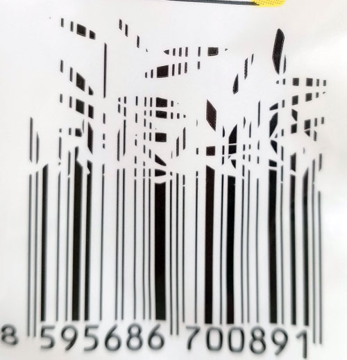 Fundstück von Honza auf einer Packung Jasmin-Reis von Globus (Eigenmarke): Ein Strichcode mit … ja, was denn eigentlich? So genau erkenne ich das auch nicht. Ich hatte es erst für Reispflanzen gehalten. Dann für inverse Reispflanzen (also weiß aus dem Strichcode ausgeschnitten), aber je länger ich das Bild betrachte, desto unsicherer bin ich ob des Motivs.