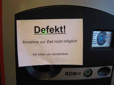Der Leergutautomat ist derzeit defekt. Zumindest teilweise, die Mehrweg-Annahme ist ausgefallen und eingeworfene Flaschen würden die ganze Mechanik blockieren. Einwegflaschen nimmt und cruncht die Maschine problemlos.