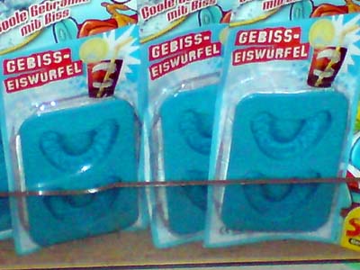 Gerade entdeckt: An der aktuellen Ausgabe der "Micky Maus" hängt ein Form, um Eis"würfel" in Gebissform zu erzeugen. Witzige Idee irgendwie. Schade nur, dass die großen Dinger nicht am Stück in meine schlanken Longdrinkgläser passen. Also bleibt's doch bei ganz normalen Eiswürfeln im Martini.