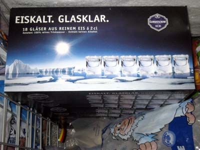 Momentan haben wir "Wodka Gorbatschow"-Eisgläser im Sortiment. Kleine 2cl-Gläser aus Eis. Tiefgefroren, logischerweise. Ob wir die dauerhaft bekommen können oder ob das jetzt nur eine einmalige Bestellmöglichkeit war, weiß ich gerade gar nicht. Aber auf jedenfall mal ein witziger Artikel.