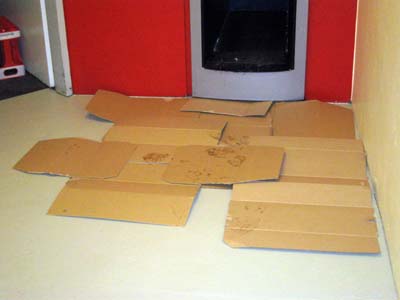 Wir versuchen schon die ganze Zeit, den schlimmsten (und in Form von Getränkeresten auch aggressivsten) Schmutz vom noch so jungen Anstrich fernzuhalten. Sieht zwar mit den ollen Pappen momentan nicht ganz so hübsch aus, wird sich auf Dauer aber hoffentlich bezahlt machen.