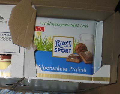 Als "Ritter-Sport-Botschafter" berichte ich nur hin und wieder (meist lobend) über die Firma Ritter Sport – ich bekomme auch immer wieder mal Muster und Gratisware. Nun kam netterweise mit der Post ein kompletter Karton mit inzwischen "richtigen" (also in Originalverpackung und nicht nur mit einem provisorischen Aufkleber) Tafeln der "Alpensahne Praliné".