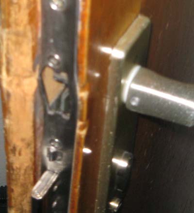 Nach einem gewissen Malheur, das mit dem Verschwinden einer nicht ganz geringen Menge Bargeld zu tun hat, hatte ich damals hier in die Bürotür ein Automatikschloss einbauen lassen. Das hatte wohl irgendwie einen Vorschaden oder war von mangelhafter Qualität – jedenfalls standen wir vor einigen Tagen plötzlich hier und kamen nicht mehr in das Büro hinein, da die Halterung der sogenannten Falle gebrochen und sich ganz unglücklich verkeilt hatte. Die folgenden Bilder sprechen eigentlich für sich und, ja, das ist eine Brechstange, was ich da auf dem oberen Bild in der Hand halte.