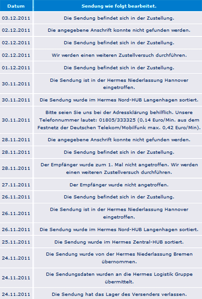 Nur einmal gab's Anlass zur Reklamation, aber das wurde auch nicht von Hermes selbst ins Ausland befördert - ich glaube DPD, bin aber nicht mehr sicher - und dort von einem italienischen Unternehmen zugestellt. Die Liste war nicht ganz so lang wie oben, aber ähnlich widersprüchlich. Einmal existierte die Adresse angeblich, einmal war angeblich niemand zuhause (falsch) und noch irgendwas. Zum Glück hatte ich das auf dem Schirm, sodaß ich mittels Intervention erst bei Hermes und dann beim Insauslandverbringer gerade noch sicherstellen konnte, daß Empfänger und Anschrift korrekt sind und das Paket nicht erst wieder nach Deutschland verbracht wurde. Dann kam es dann auch prompt an.