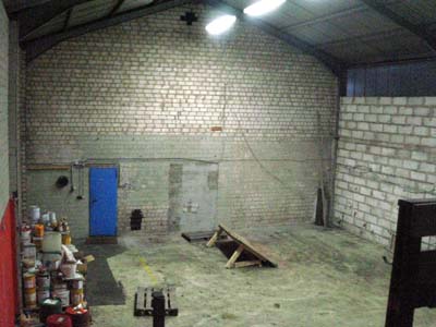 Blick von der zweiten Ebene in die andere Richtung. Deutlich zu sehen ist der große Berg Altchemikalien. Insgesamt macht die Halle so von innen natürlich einen recht traurigen Eindruck. Wenn der Fußboden erstmal gereinigt ist und die Wände weiß gestrichen wurden, wird das alles schon viel besser aussehen.
