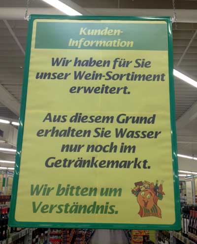 Das Schild richtet sich doch an diejenigen, die verzweifelt das Wasser suchen. An wen richtet sich das Schild im ersten Satz? Was interessiert den Wasserkäufer die Erweiterung des Weinangebotes? Und ist es nicht vollkommen egal, ob das Wasser jetzt im Geetränkemarkt steht, weil das Weinangebot erweitert wurde, es neue Gesetze gibt oder vielleicht Tante Erna krank ist?