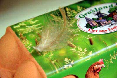 "Iiiieh, das ist ja voll ekelig. Da klebt eine Feder an der Packung. Das ist ja sowas von unhygienisch!!!", drang es aus dem Laden in mein Büro. Tatsächlich: Eine Hühnerfeder hing an einer Eierverpackung fest.