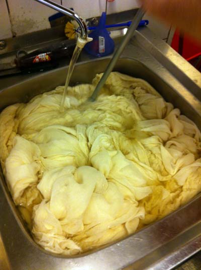 Die Gaze lag teilweise sehr eng in der Farbe und wer jetzt vermutet, dass das Ergebnis der Färberei doch vermutlich sehr ungleichmäßig geworden sein dürfte, hat Recht. Aber genau das war ein durchaus gewollter Nebeneffekt. Wenn die Bahnen getrocknet sind, seht ihr auch, warum das so ist!