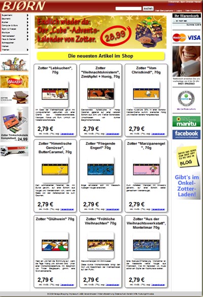 Wenn ich schon den Sonntag im Büro hocke, soll dabei ja auch was Produktives herauskommen. In der letzten halben Stunde habe ich erstmal die Weihnachts-Sorten von Zotter in den Onlineshop gehackt. Vielleicht möchte ja der eine oder andere da draußen bei mir noch etwas Umsatz generieren.