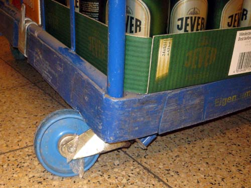 Hier eine Aufgabe für Leser/innen mit technischem Verständnis (und/oder viel Kreativität): Dieser Rollbehälter voller Getränke ließ sich nur bewegen, in dem wir ihn mit einem Hubwagen angehoben haben. Obwohl alle vier Räder vorhanden waren, hat es keiner von uns geschafft, den Behälter ohne Hilfsmittel von der Stelle zu schieben.