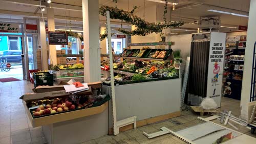 Auf der Rückseite des alten Walkers-Regals waren Dressings und Salatkräuter und ähnliche Artikel platziert. Die haben wir jetzt erstmal provisorisch in einer der neuen Gondeln untergebracht. Zukünftig sollen sie oberhalb eines niedrigen Kühlregals in der Gemüseabteilung stehen.