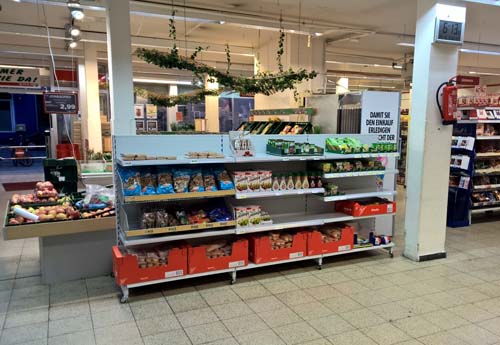 Das kleine Regal haben die Kollegen gestern noch zuende aufgefüllt und den ordentlich gereinigten Platz des alten Chipsregals gestellt. So stehen die Salatdressings und Croutons nun erstmal da und warten darauf, dass die neue Gemüseabteilung hier einzieht. Das wird aber leider noch etwas dauern müssen.