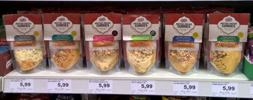 Hat zugegebenermaßen ein paar Tage länger gedauert, aber heute haben wir es endlich geschafft, die sechs Sorten Curry-Kochmischungen hier im Laden unterzubringen. Den Preis habe ich aber wie empfohlen bei sechs Euro gelassen: