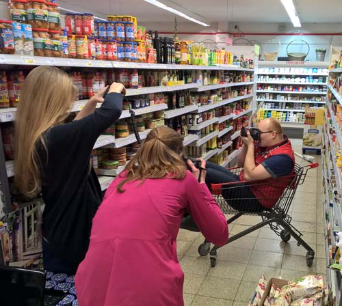 Das Interview verlief ausgesprochen sympathisch und hat uns allen viel Spaß gemacht. Hier machen wir gerade ein mögliches Foto für die Verwendung im Beitrag. Da ist nichts gestellt, ich schwör's!!! Das ist meine typische Pose, ich hocke schließlich immer in einem Einkaufswagen, wenn ich meine Bilder für's Blog mache. Ich kann mir gar keine bequemere Sitzgelegenheit vorstellen.