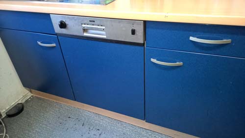 Kleiner Ausschnitt aus der Küchenzeile hier bei uns im Aufenthaltsraum im Markt in der Gastfeldstraße. Zwischen den beiden Unterschränken befindet sich ein Geschirrspüler. Das Teil funktioniert zwar noch irgendwie, aber andererseits ist das Gerät nach deutlich über 12 Jahren Misshandlung Gebrauch durch die unterschiedlichsten Mitarbeiter komplett abgängig – angefangen bei der inzwischen seit Jahren fehlenden Kunststoffblende am Handgriff.