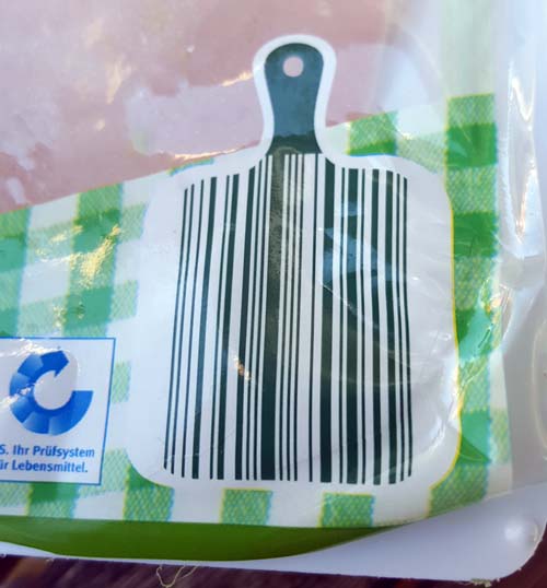 Funstück von Sebastian auf einer Aldi-Mortadella: Strichcode in Form eines Schneidebretts. Auch nicht schlecht.