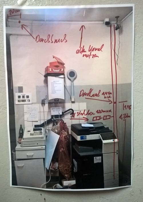 Eigentlich hatte ich mir vorgenommen, heute in der Firma lediglich eine Notiz für den Elektriker vorzubereiten. Dass da ein Überfall noch dazwischenkommt, hat wohl niemand vorhersehen können. Da ich morgen früh erst um 9 Uhr hier sein kann, der Elektriker mit der Verkabelung des Kassenbüros schon aber um 7 Uhr anfängt, habe ich einfach mal ein Foto der Wand ausgedruckt und ein paar Notizen hinterlassen, wie er da was bauen soll. Die meisten Teile waren ohnehin schon besprochen, die rudimentären Infos reichen also.