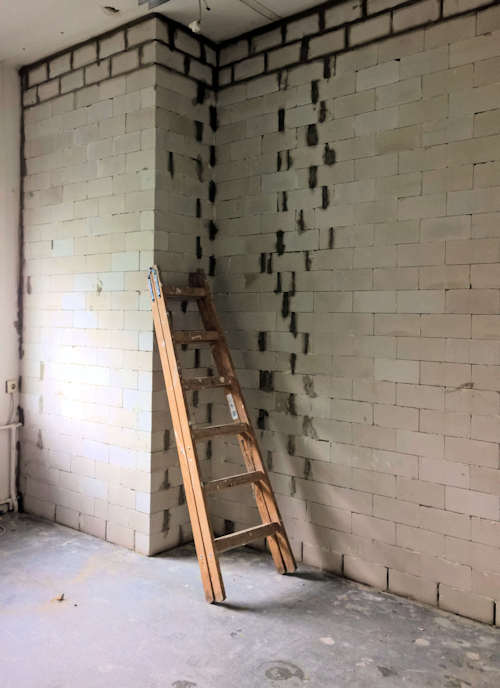 Jo. Die Maurer sind so weit fertig, die Wand steht. Leider erst nächste Woche Mittwoch werden die Steine noch verputzt. Etwas Zeit soll die Wand nämlich bekommen, damit der Anschluss oben an die Decke etwas besser aushärten kann, aber bis dahin wird uns nicht langweilig werden. Kabelkanäle, Telefon- und Netzwerktechnik – und natürlich die angefangenen Abbrucharbeiten im Keller möchten ebenfalls fortgesetzt werden.