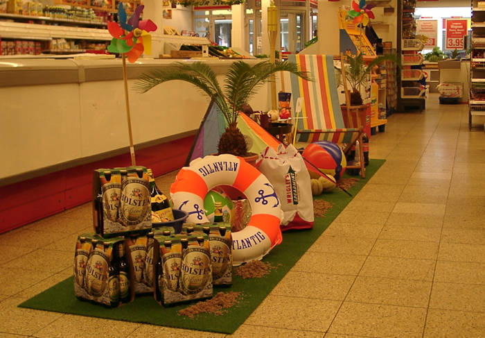 Wir haben dazu einen kleinen Aufbau gemacht. Ohne speziellen Sonderverkauf, das gab der Platz einfach nicht her, sondern rein zu dekorativen Zwecken: Ein Streifen Kunstrasen mit Sand und Liegestuhl, Grill mit Plastikgemüse, Palmen, Bier und Strandspielzeug. Wird vermutlich nicht mehr Umsatz bringen, ist aber auf jeden Fall ein kleiner Hingucker: