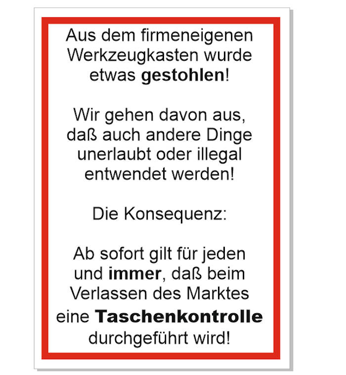 Aus dem Frust aufgrund eines Diebstahls haben wir uns zu etwas Aktionismus hinreißen lassen und dieses Schild an die Lagertür gehängt. Faktisch umgesetzt haben wir die Taschenkontrollen letztendlich nie …
