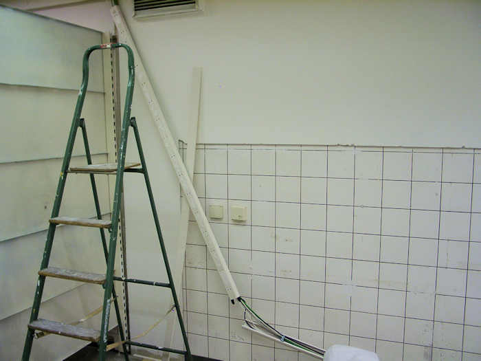 Um die Fliesen an der Rückwand der alten Wurst- und Käse-Bedienungsabteilung mit Rigips verkleiden zu können, mussten wir vorübergehend die Kabelkanäle demontieren, in denen ein paar Strom- und Videokabel liegen.
