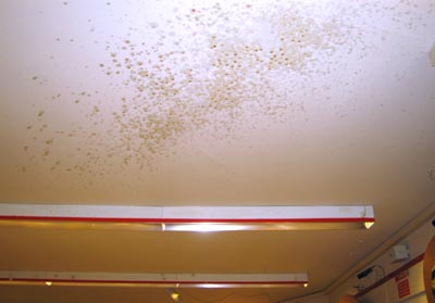 Dummerweise ist das Malheur ausgerechnet an einer Stelle passiert, an der sich zwei Gänge kreuzen. Neben der Kundin und der Decke (siehe Foto) hat es dann noch gleich natürlich die gesamte Ware im Cola-Regal, Säfte, Strümpfe, Waschmittel und Körperpflegeprodukte erwischt. Und zwar großzügig. Zwei Mitarbeiter haben eben eine knappe Stunde lang mit Lappen bewaffnet jedes einzelne Teil und die Regale drumherum gesäubert...