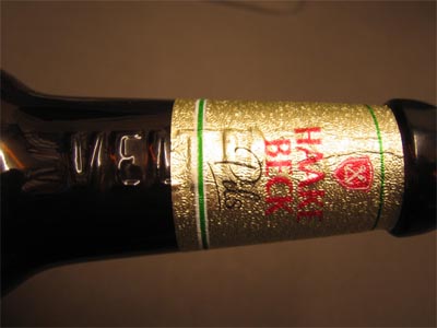 Auf dem Foto leider nur schlecht zu erkennen: Das "VELTINS"-Relief am Flaschenhals, über dem die "Haake-Beck-Pils"-Banderole klebt. Warum sollte Haake-Beck auch nicht auf den eigenen Produkten Werbung für die Wettbewerber machen?