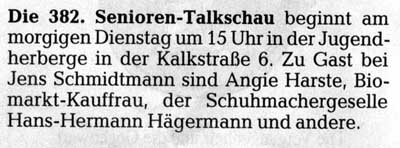 Björn hatte leider keine Zeit und daher übernehme ich den Part, den SPAR-Markt Harste in der Talkshow zu präsentieren. Eine angefragte Aufzeichnung durch den Hörfunk ist eher unwahrscheinlich, es handelt sich ja nur um das Jubiläum 19 Jahre Talk, das Aufnahmevolumen ist auf ca. 6 Termine jährlich begrenzt und heute werden keine berühmten Gäste erwartet. Da der Weserkurier kommt, wird es hoffentlich eine kleine Berichterstattung geben.