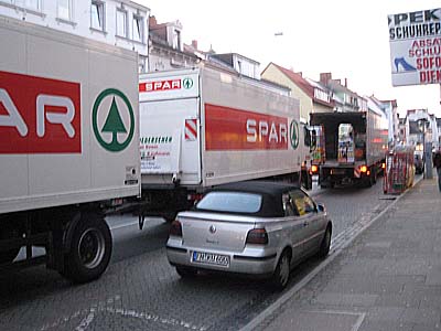 Da staunte ich nicht schlecht, als heute Morgen gleich zwei Vierzigtonner der SPAR hier vorgefahren sind. Der hintere hatte allerdings nur ein paar Rollcontainer geladen, die auf den Sattelschlepper (rechts im Bild) nicht mehr draufpassten.