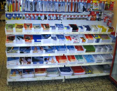 Am Anfang hatten wir diese Artikel vor allem aus Platzgründen nicht geplant, aber das muss ja nicht bedeuten, dass man sich nicht auf die Wünsche der Kunden einstellen kann. Nachdem nun ein freies Regal geschaffen wurde, gibt es jetzt eine recht ansehnliche Auswahl an Schreibwaren, darunter vor allem Schulhefte aller Art.